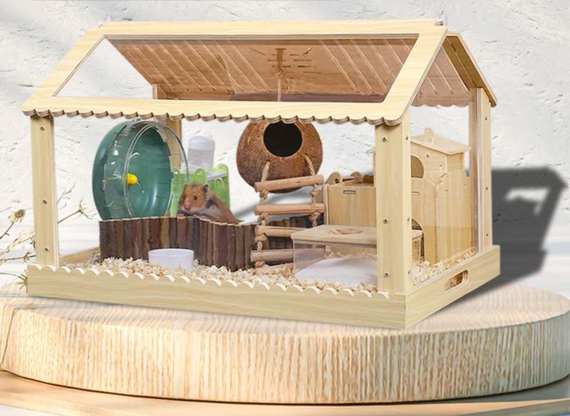 透明なアクリル素材で作られたこのハムスターケージは、リビングなどの置く場所でペットの様子を常に観察できる設計です。