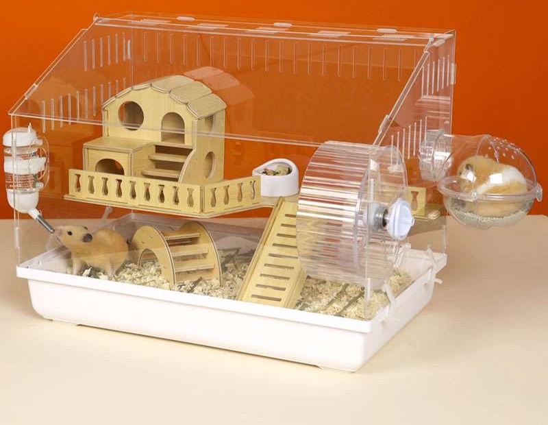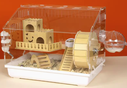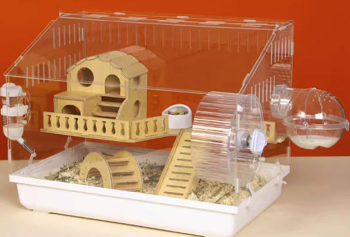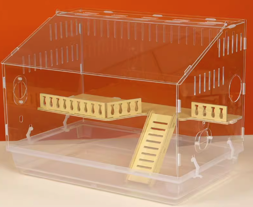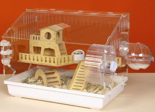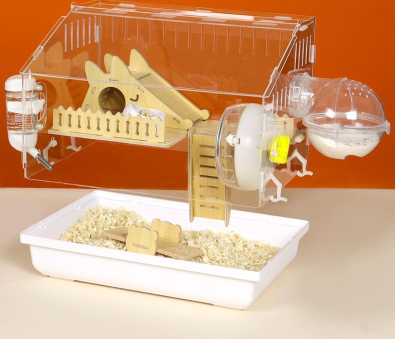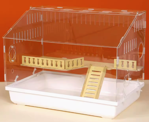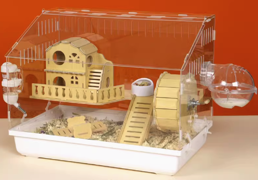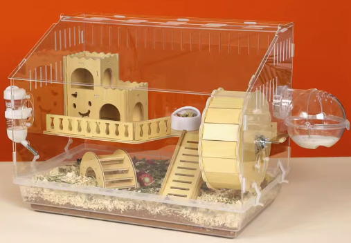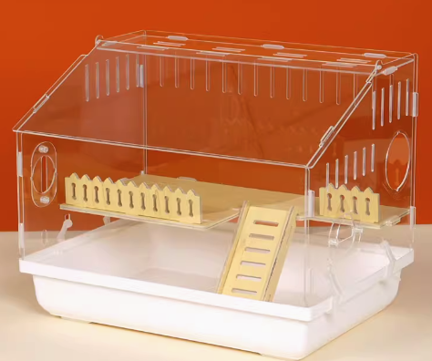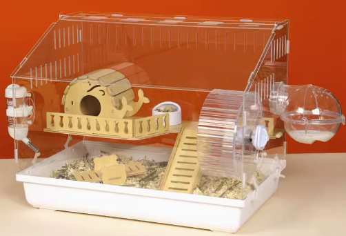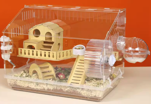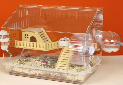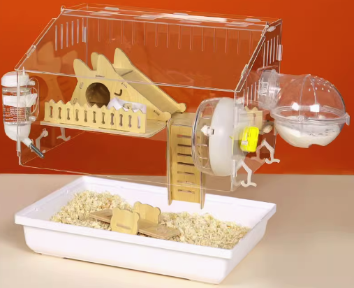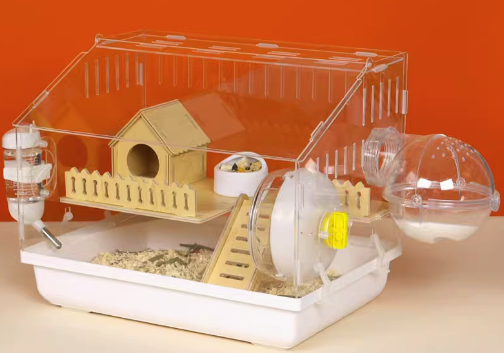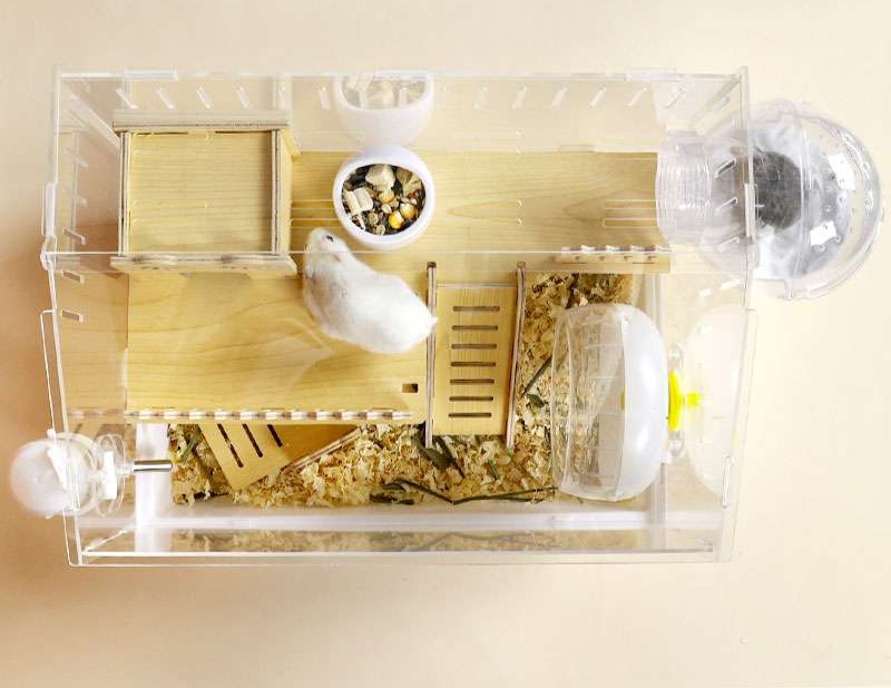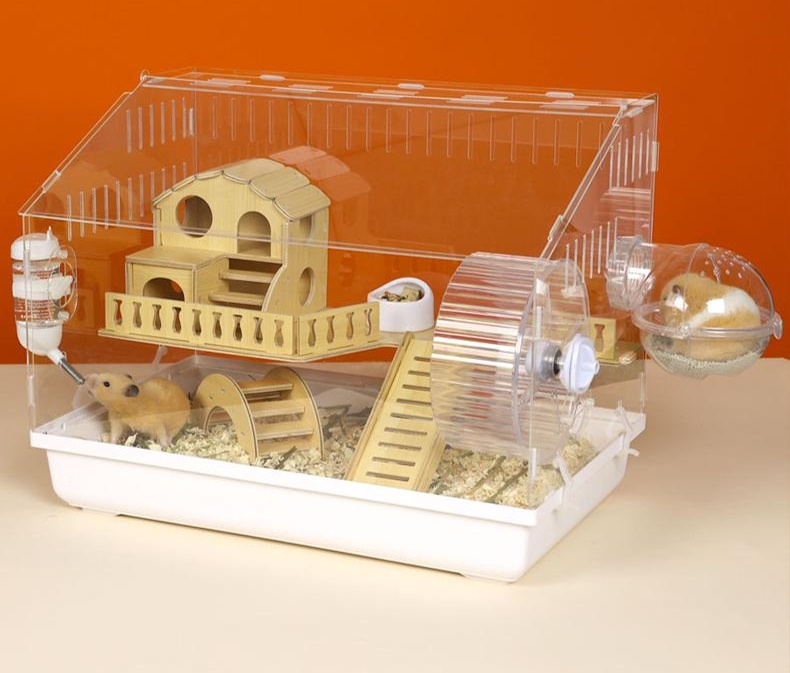 高品質アクリル素材の二階建てハムスターケージ。 透明感があり愛するペットの様子を常に観察可能。 給水器と運動用車輪付きで、小動物の快適な住環境を提供。 木製の階段と小屋で自然な遊び場を確保しながら、通気性に優れた設計で清潔さを保持。 観賞用としても楽しめる理想的なハムスターの住まい。