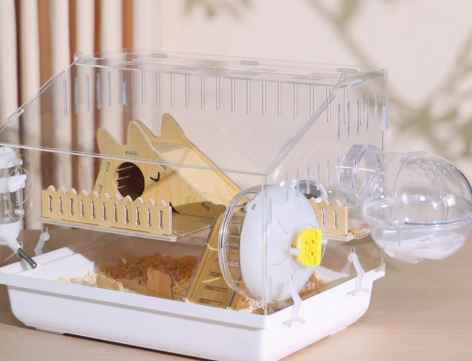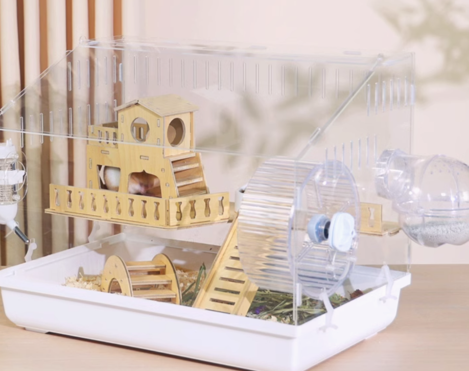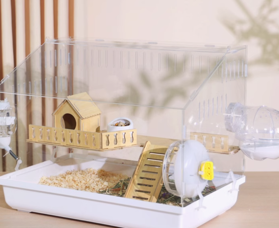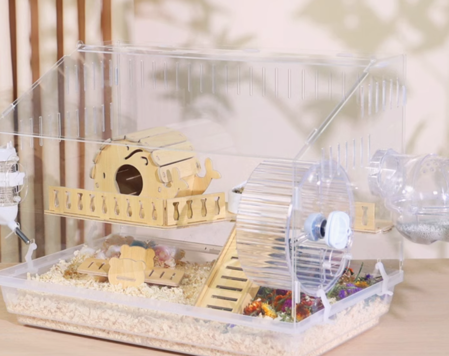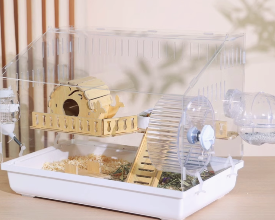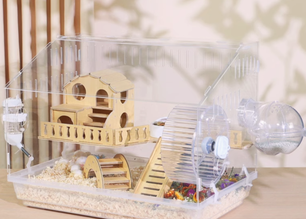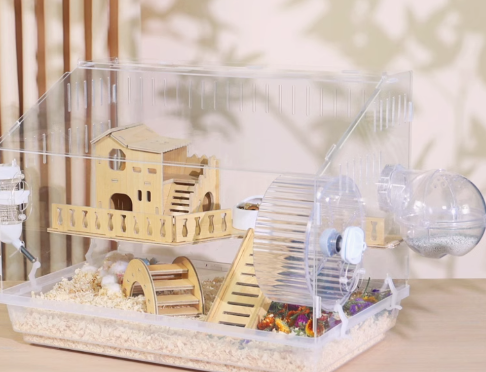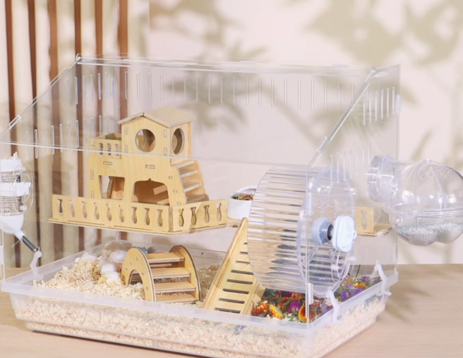 木製の遊び場とプラスチック製の回し車を組み合わせた多機能ハムスターケージ。アクリル素材の外装で清潔感があり、木製のハウスと遊具で快適な住環境を提供。 給水ボトルと餌入れも完備された使いやすい設計です。