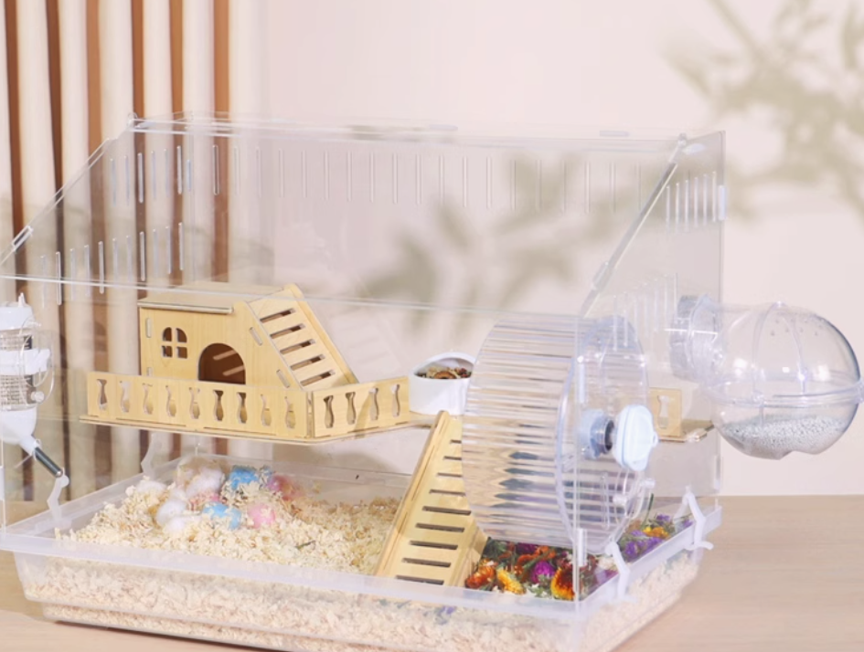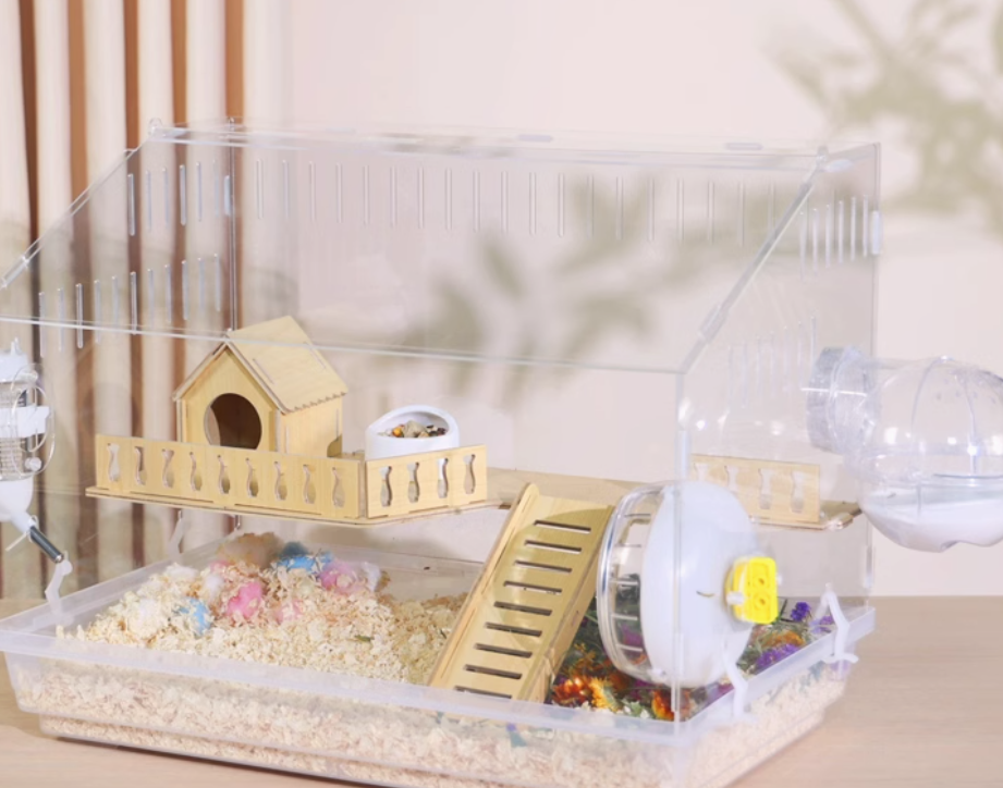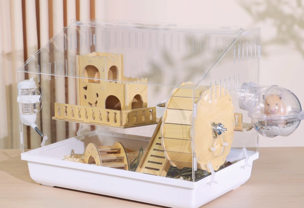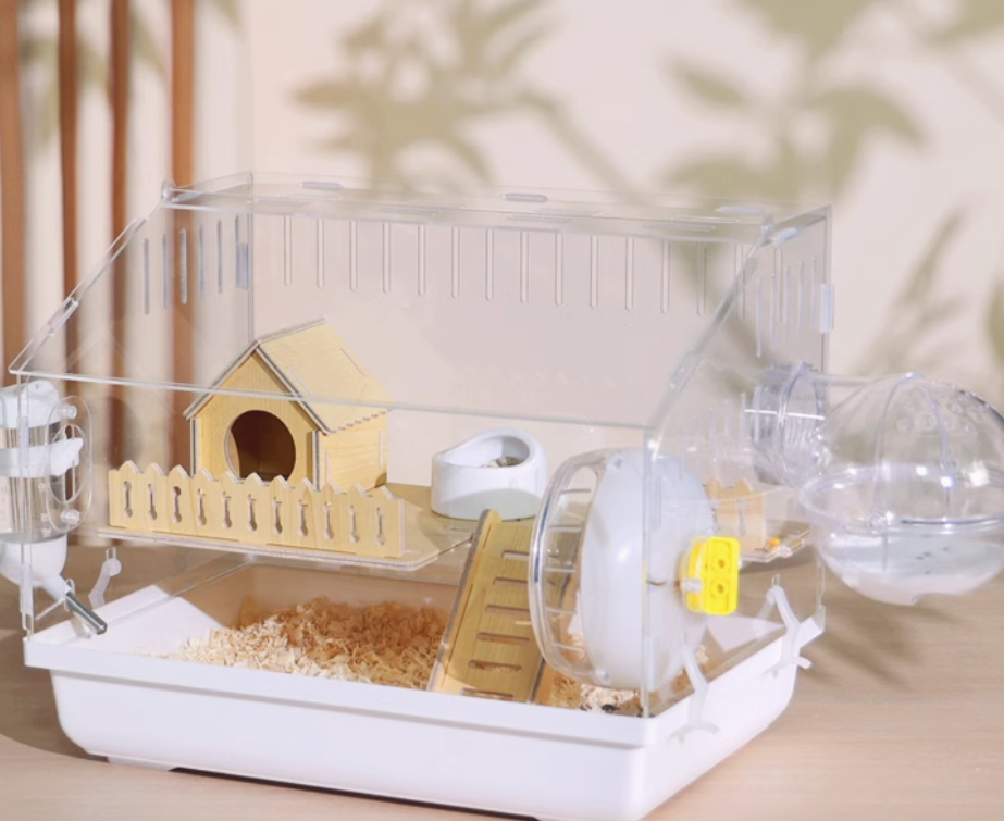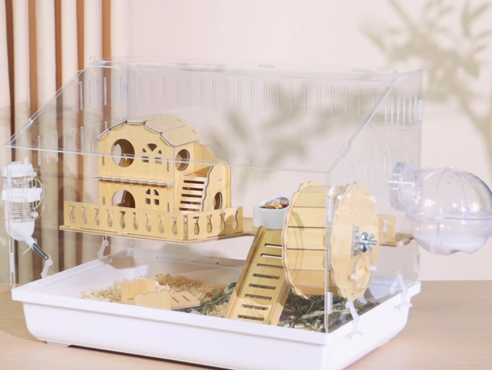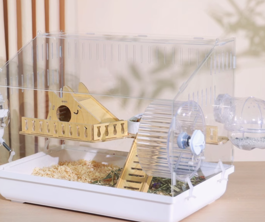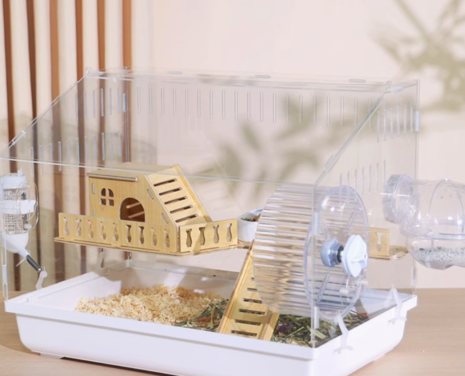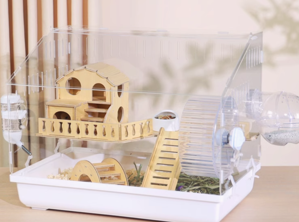 木製の遊び場とプラスチック製の回し車を組み合わせた多機能ハムスターケージ。アクリル素材の外装で清潔感があり、木製のハウスと遊具で快適な住環境を提供。 給水ボトルと餌入れも完備された使いやすい設計です。