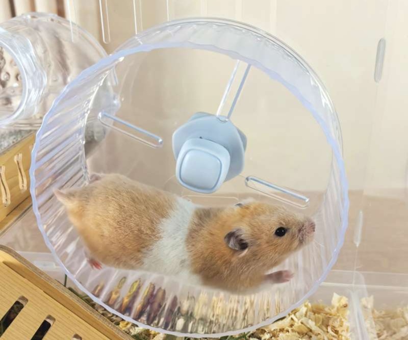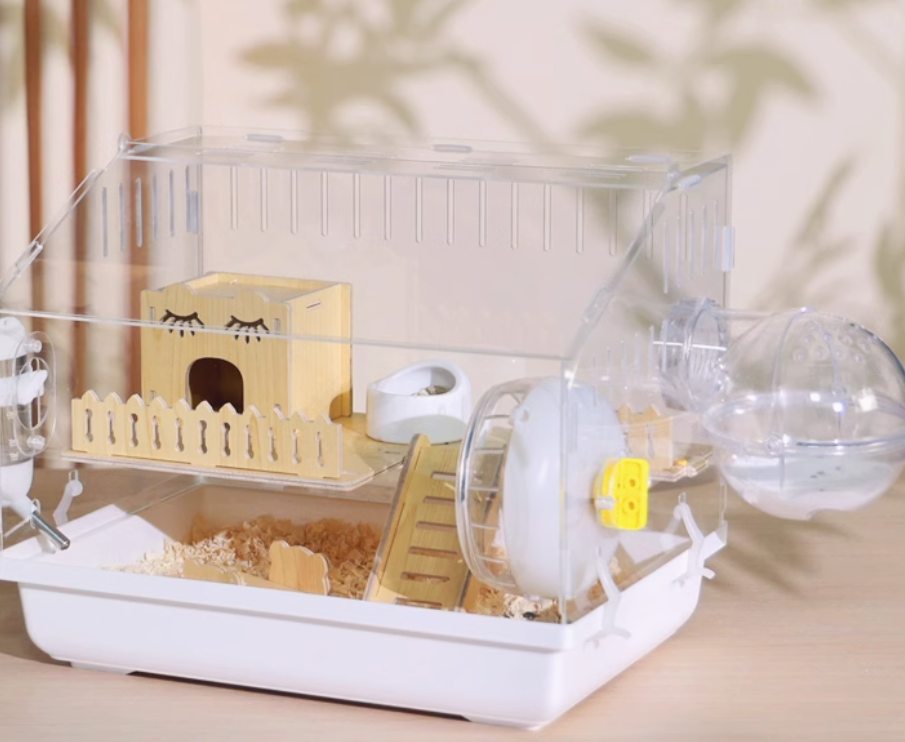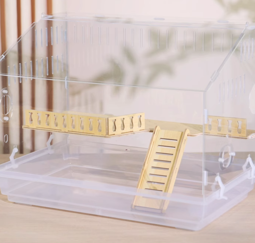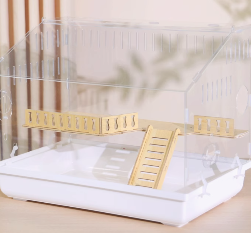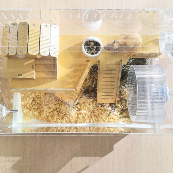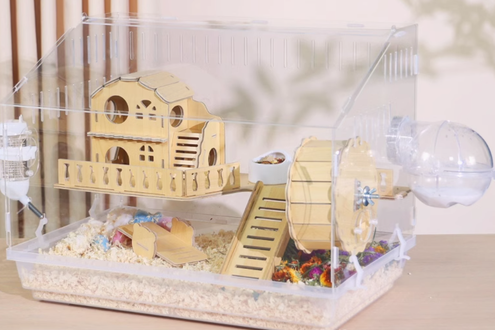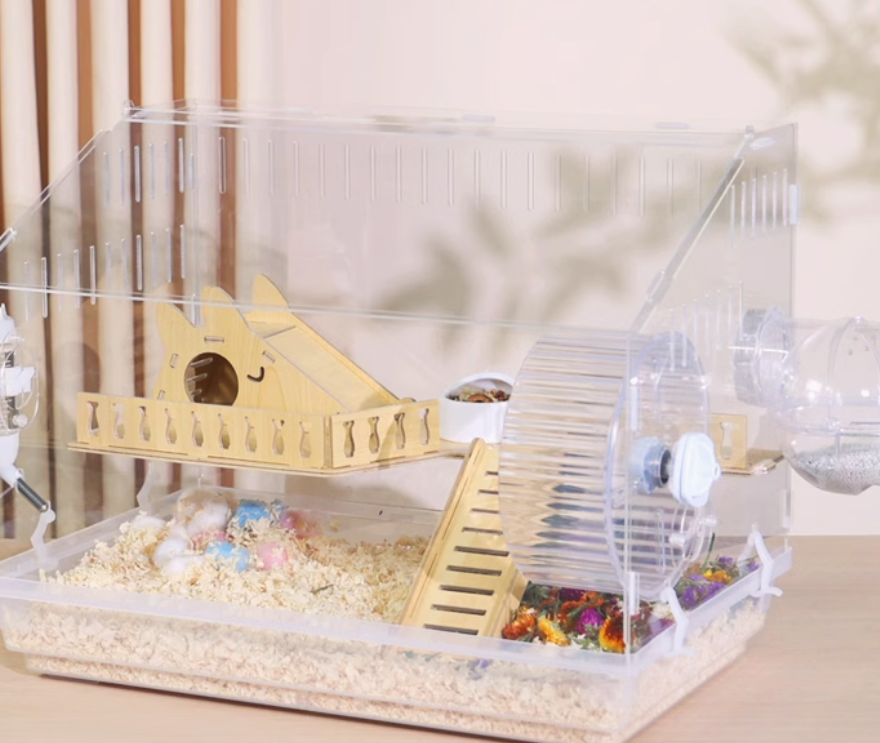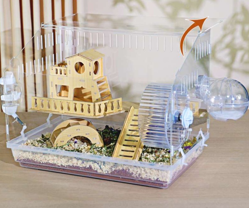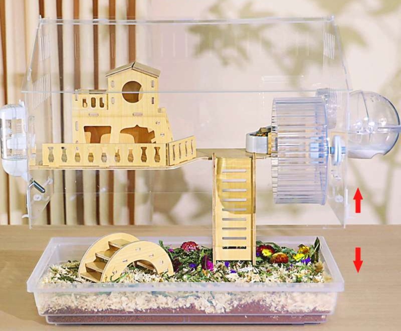 木製の遊び場とプラスチック製の回し車を組み合わせた多機能ハムスターケージ。アクリル素材の外装で清潔感があり、木製のハウスと遊具で快適な住環境を提供。 給水ボトルと餌入れも完備された使いやすい設計です。