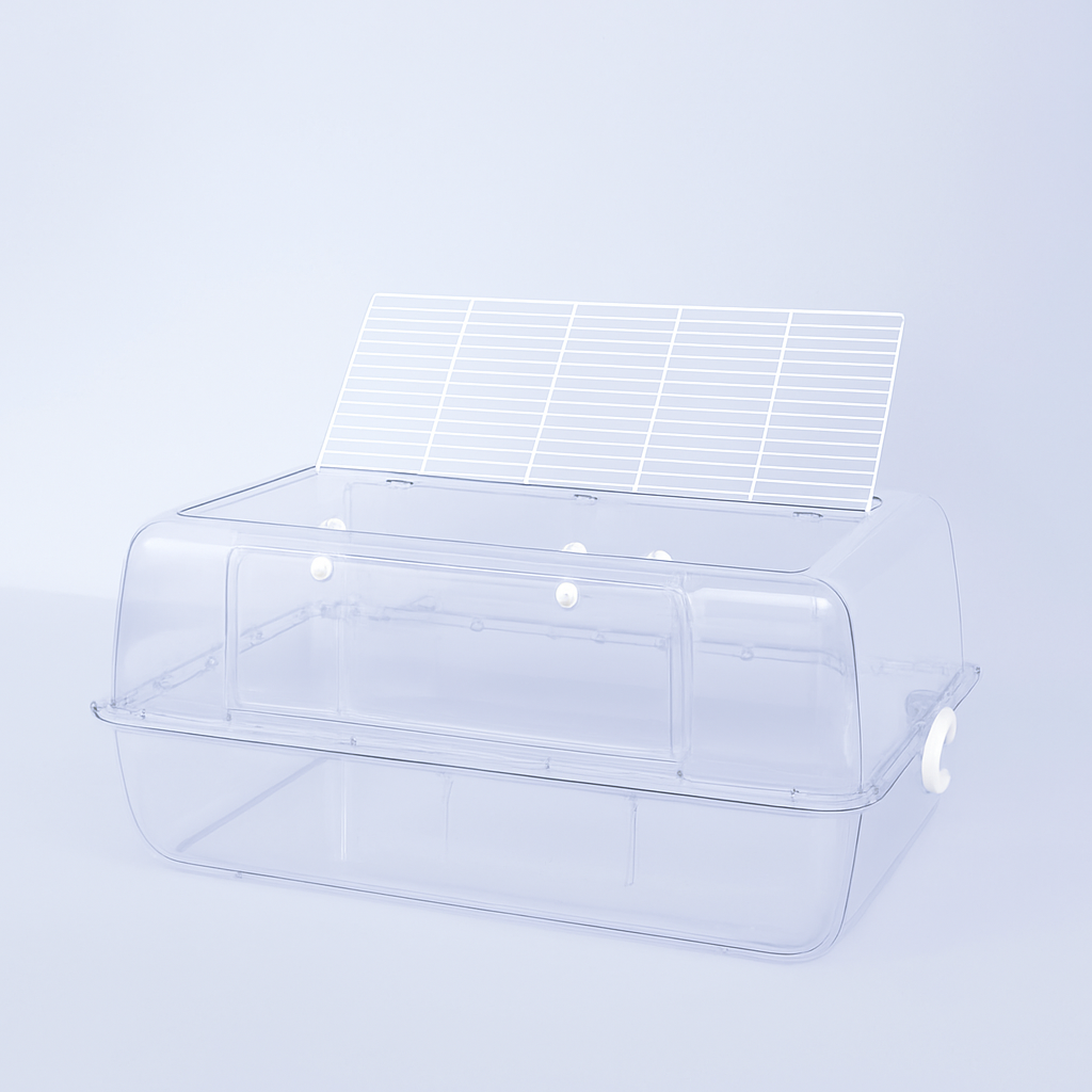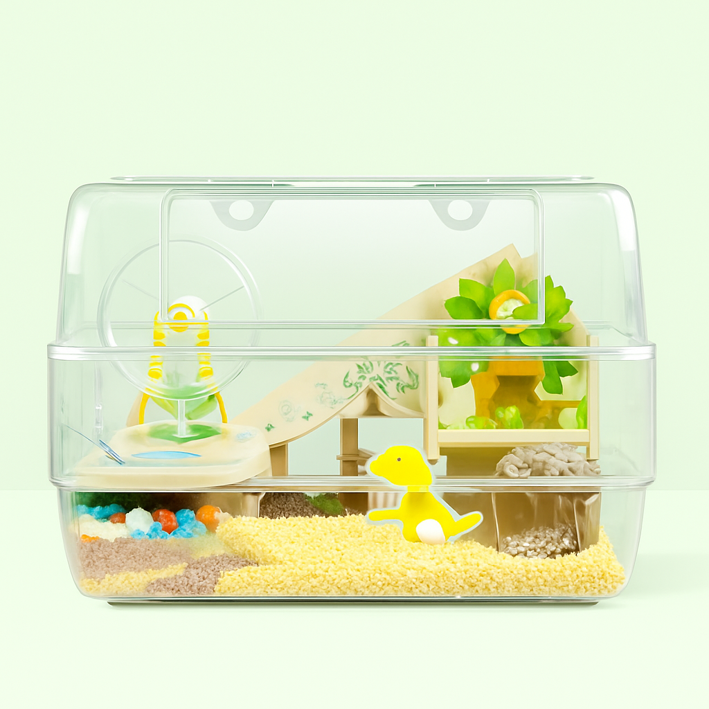 このハムスターケージは透明なプラスチック素材で作られた二階建て構造の飼育空間です。 回し車やはしご、小屋などの充実したアクセサリーが付属し、ハムスターが快適に遊べる環境を提供します。 上部が大きく開閉できるため、お手入れや給餌も簡単に行えます。 広々とした空間設計で、ペットの様子を360度観察できる見やすいデザインが特徴です。