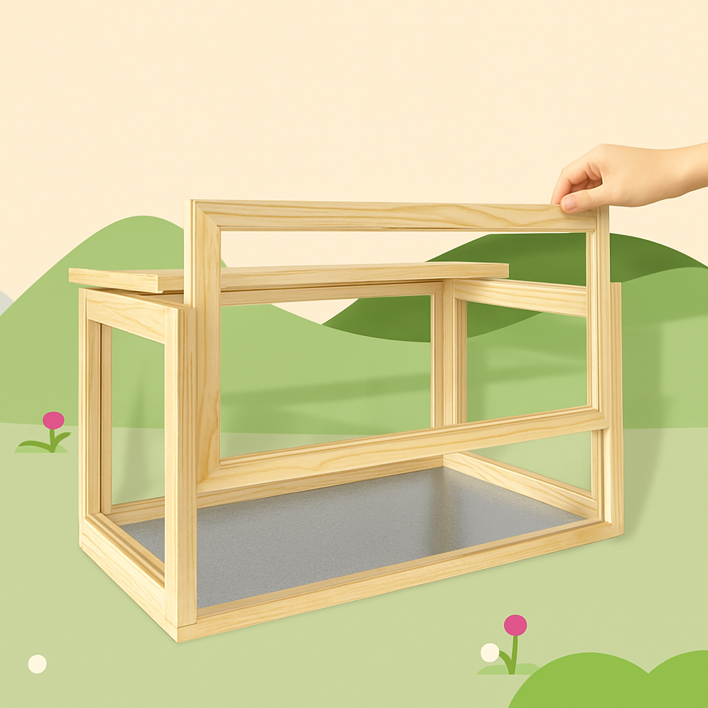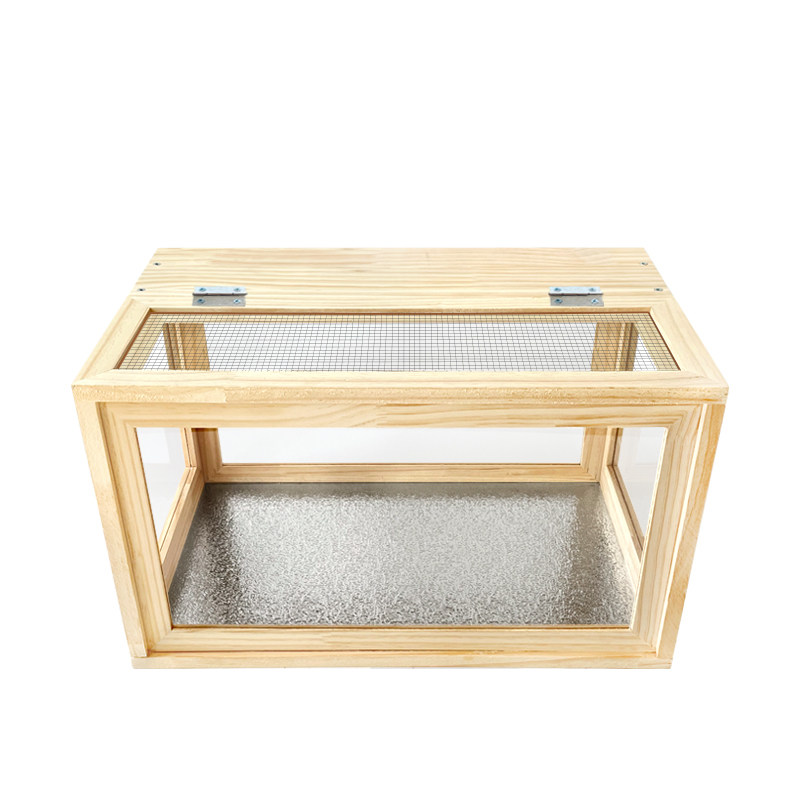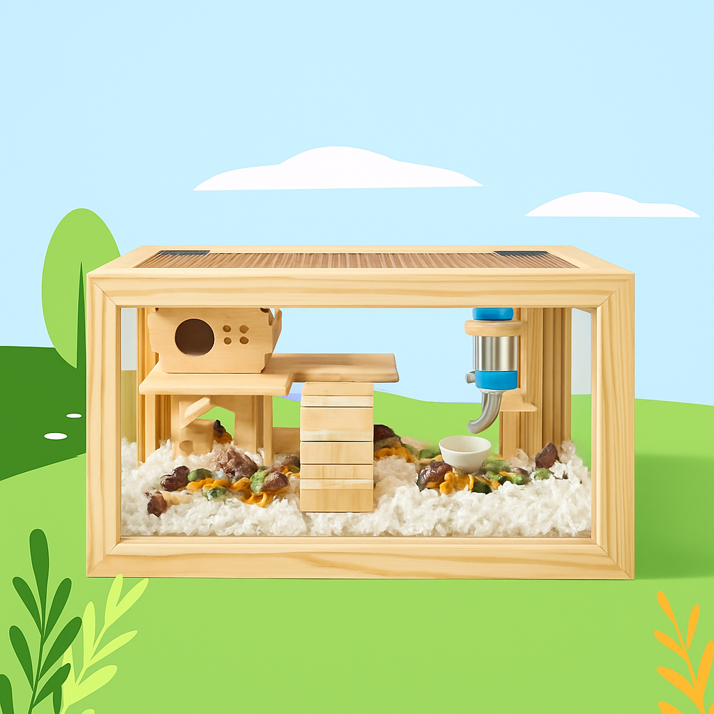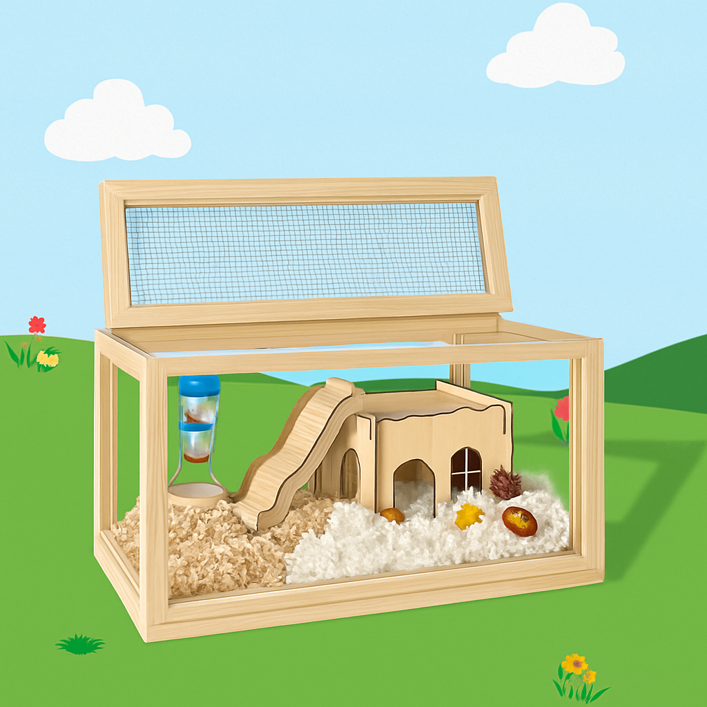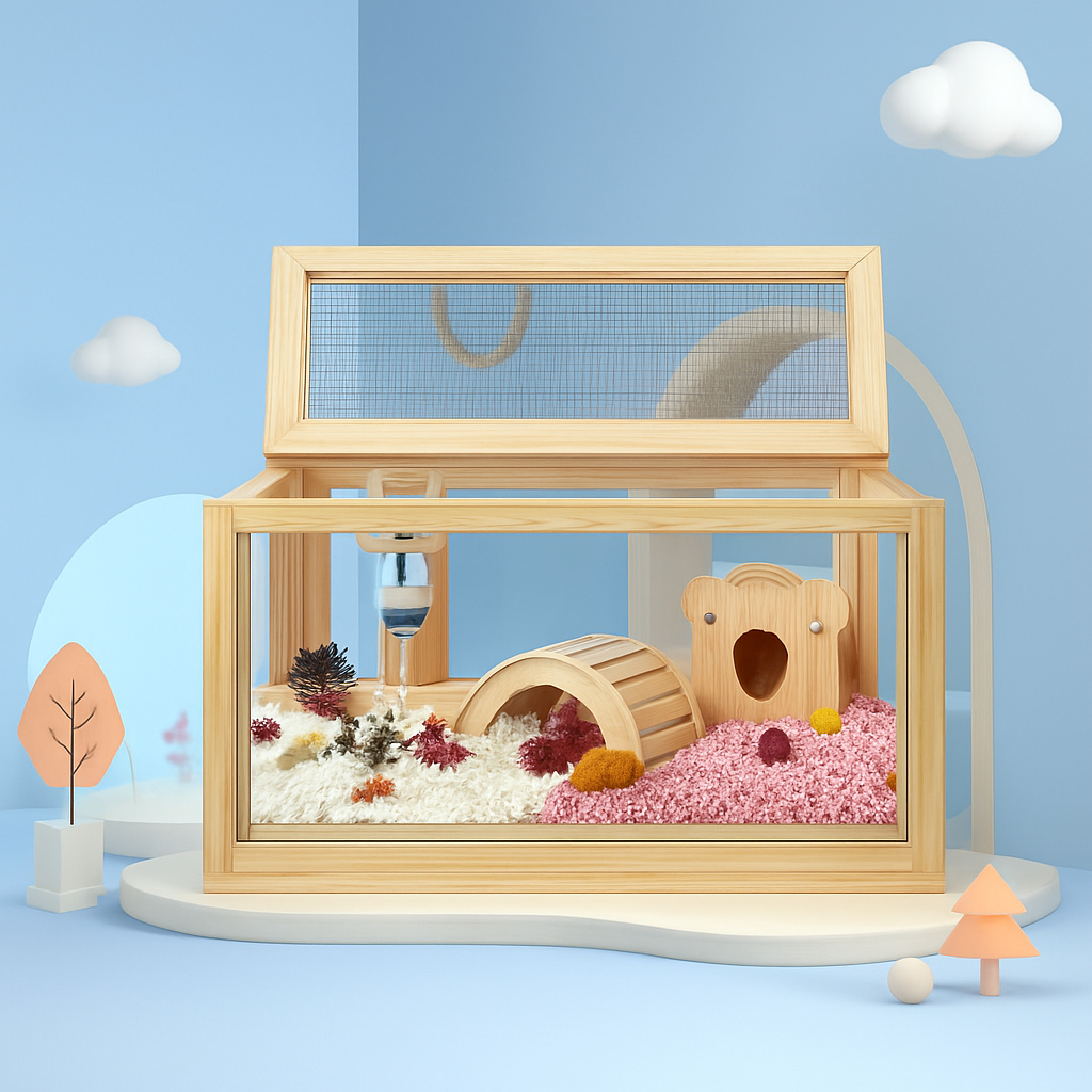 四面がガラスまたは透明素材で覆われた木製のハムスターケージです。 上部は金網の開閉式蓋になっており、通気性を確保しながら簡単にお世話ができます。 全方位から愛らしいペットの様子を観察でき、給水器や階段付き小屋などのアクセサリーも設置可能です。 天然木のフレームが温かみのある雰囲気を演出し、インテリアとしてもお部屋に馴染みます。 小動物の快適な暮らしをサポートする理想的な飼育空間です。