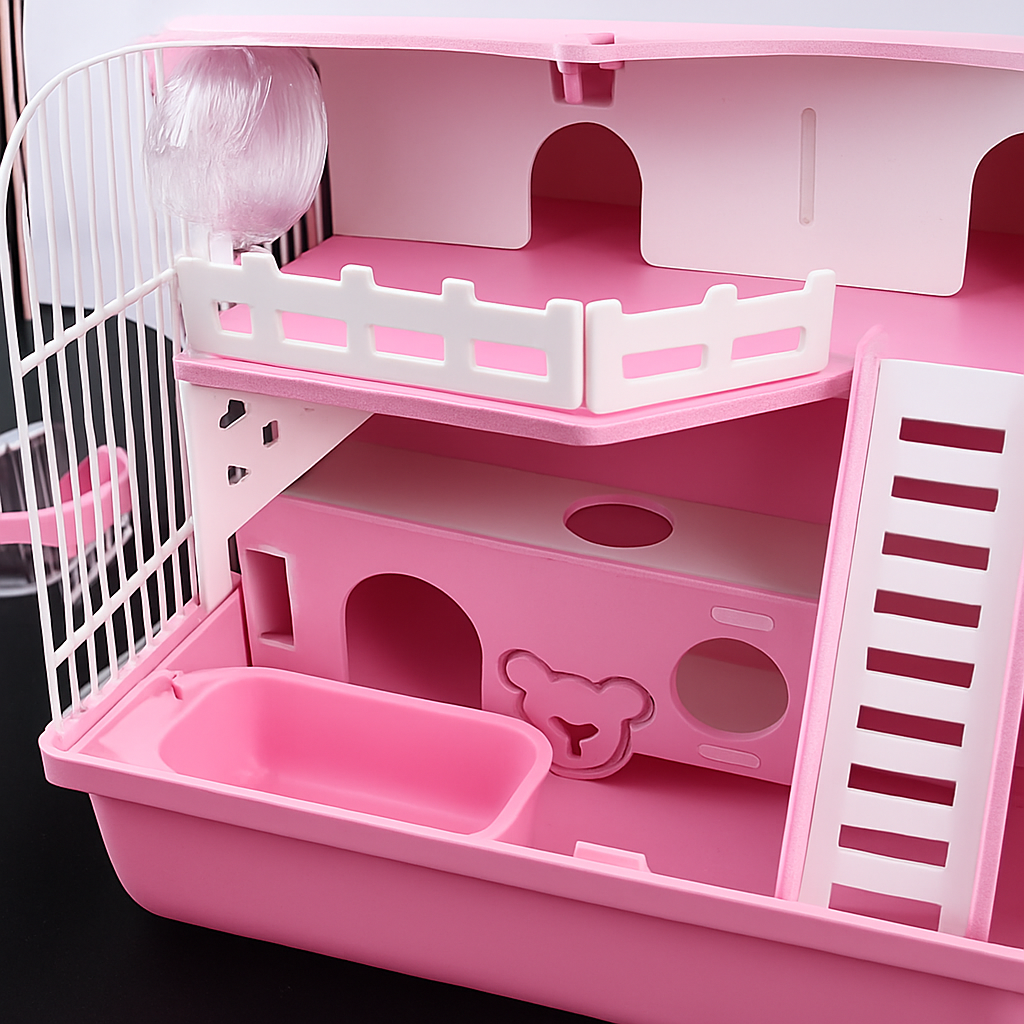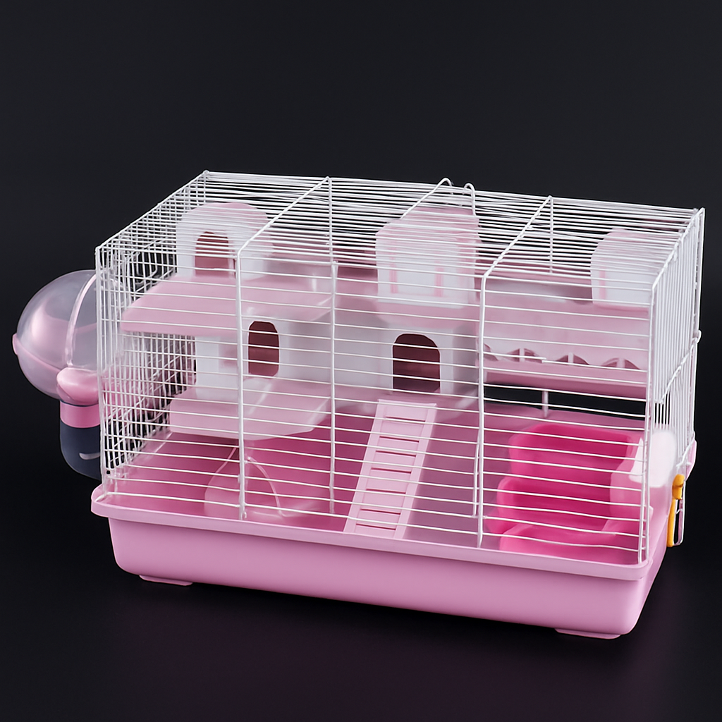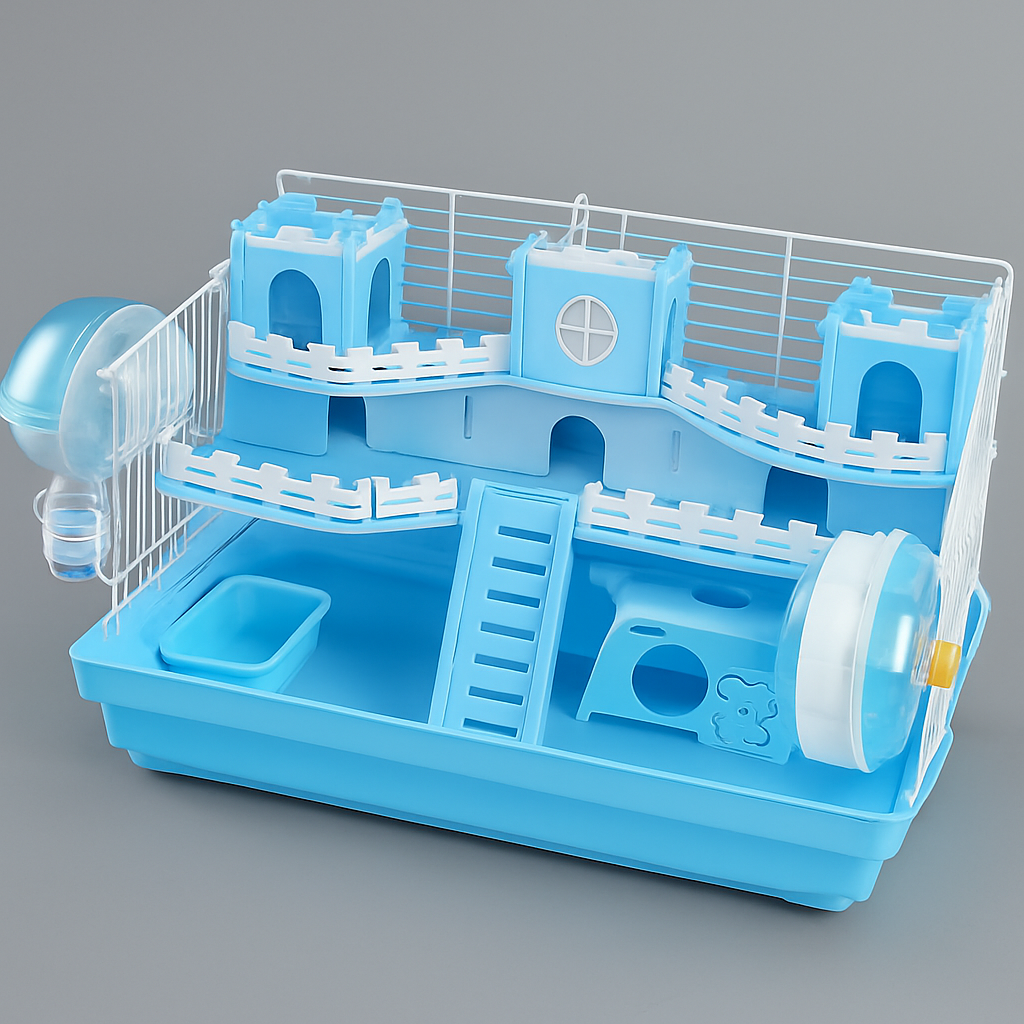 お城のような可愛らしいデザインが特徴のハムスターケージです。 二階建て構造で小屋が複数配置され、階段で行き来できる遊び心満載の設計になっています。 プラスチック製で軽量かつお手入れが簡単で、回し車や給水ボトル、餌入れなどの飼育用品が一式揃っています。 広々とした空間で小動物が快適に過ごせる充実の飼育環境を提供します。
