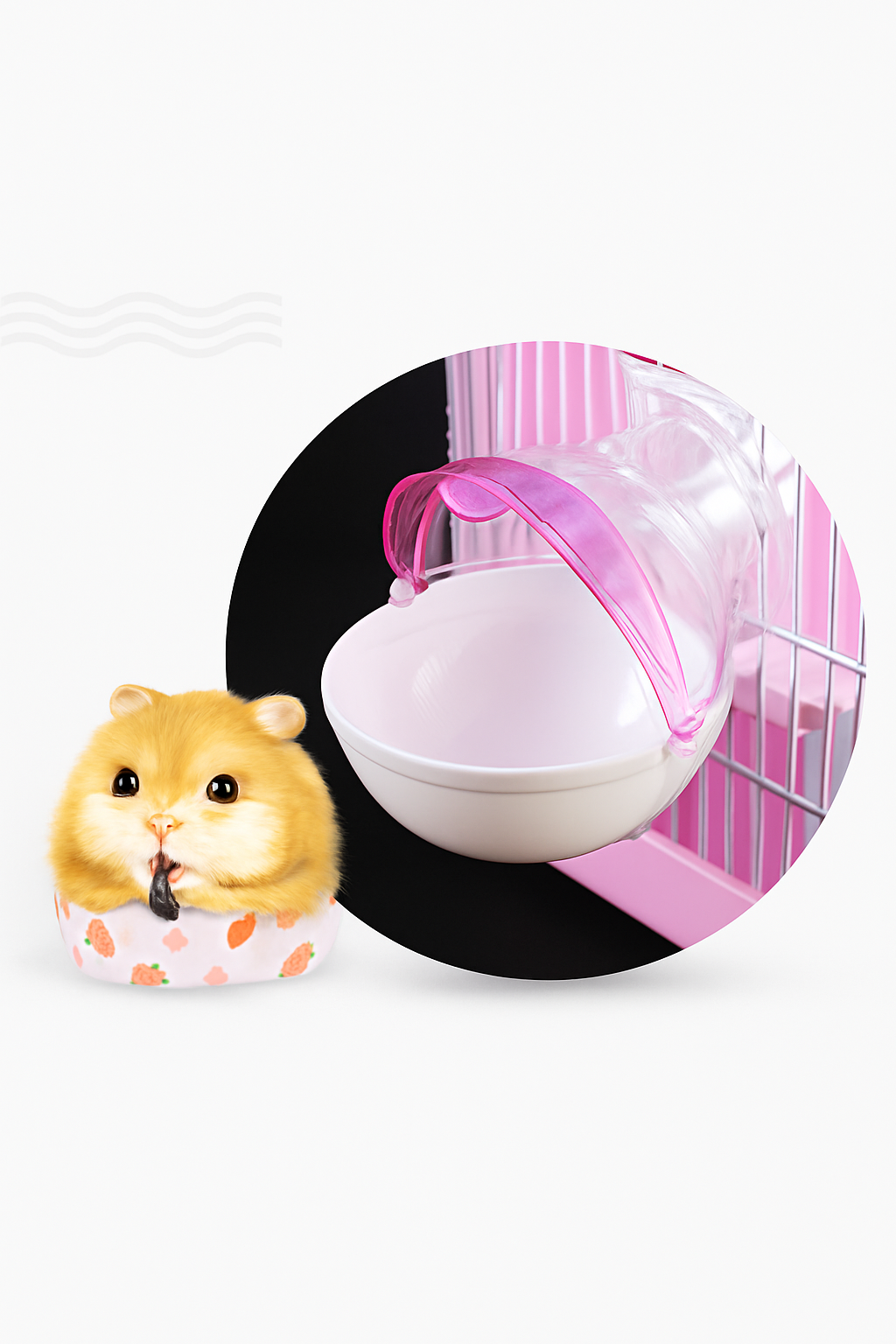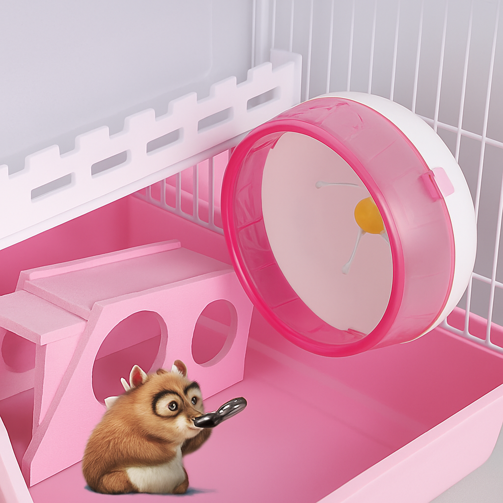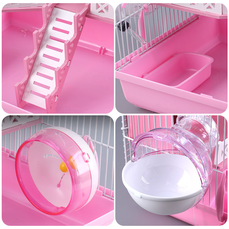 プラスチック製で軽量かつお手入れが簡単で、回し車や給水ボトル、餌入れなどの飼育用品が一式揃っています。