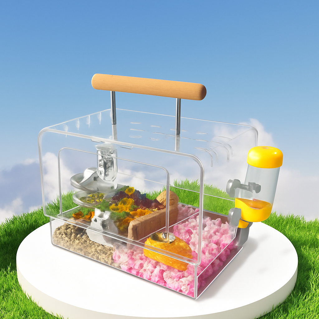 お出かけに便利な持ち手付きのハムスターケージです。 アクリル素材を使用した透明設計で、大切なペットの様子をいつでも確認できます。 三面に通気穴を配置し、快適な空気循環を実現しました。 給水器や餌入れも設置可能で、移動中も安心してお使いいただけます。 取っ外し可能な仕切り板付きで、お手入れも簡単です。 軽量で持ち運びやすく、旅行や通院時に最適な携帯用ケージです。