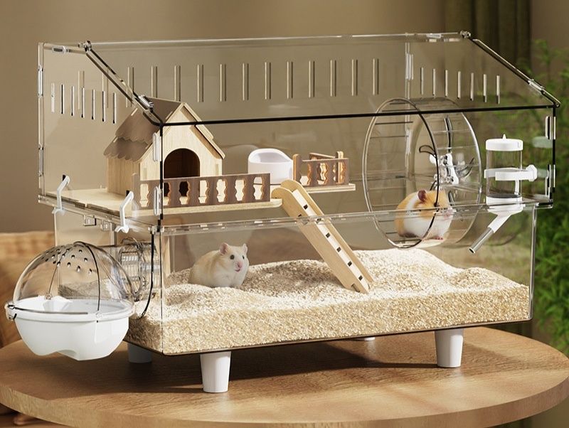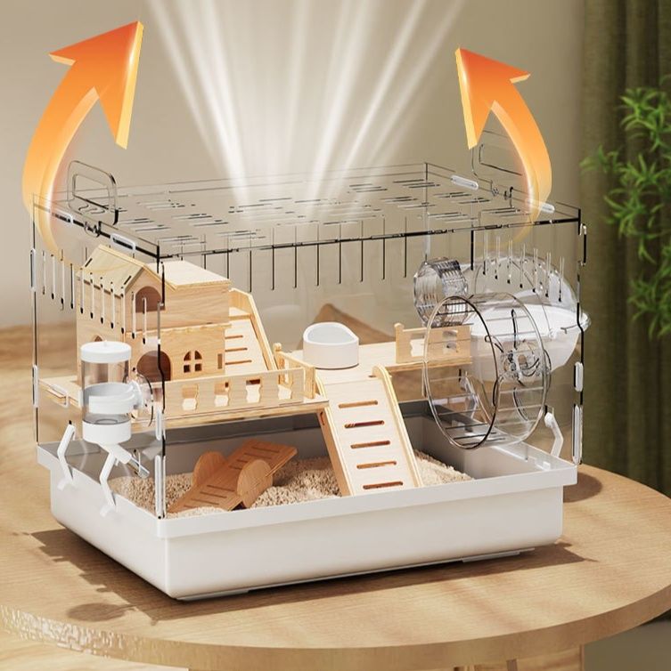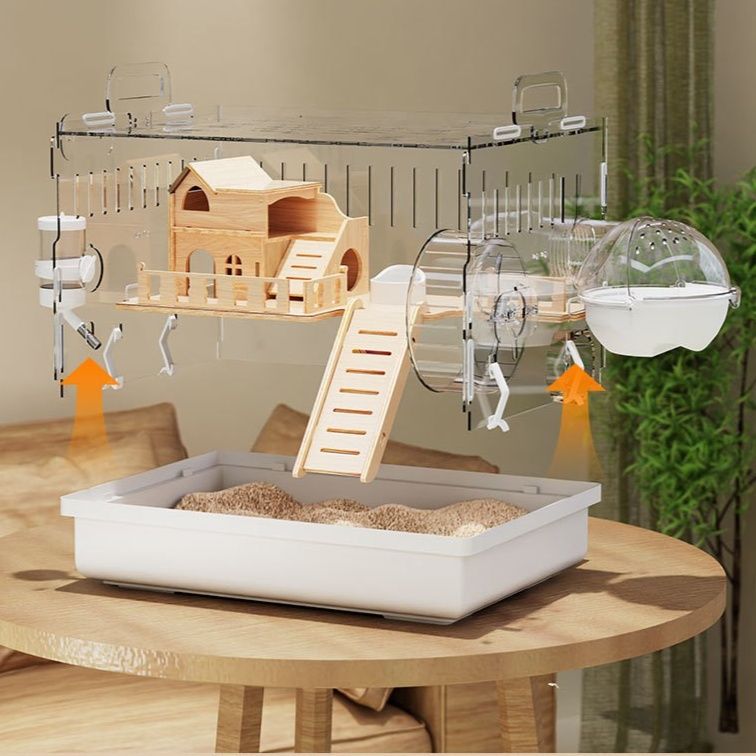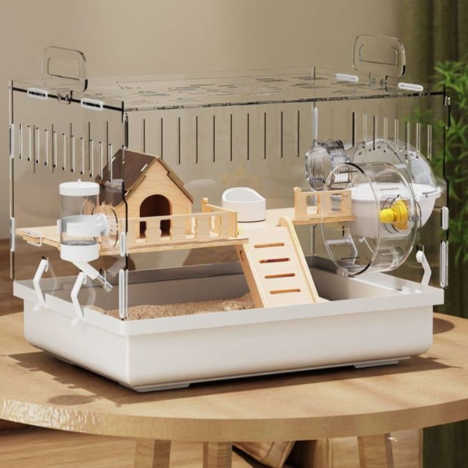 透明なプラスチック素材で愛らしいペットの様子が見やすく、回し車やはしご、小屋などの充実した付属品で快適な飼育環境を提供します。